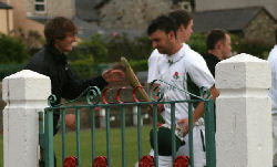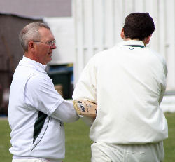 Carnforth's John Denwood congratulates Boucher on his hundred |