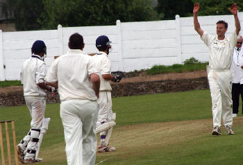 Morecambe's Jono Gates celebrates a leg before decision to dismiss Darwen's Kamran Anwar |