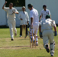 Kendal captain/pro Ross McMillan celebrates the wicket of Ryan Nelson |