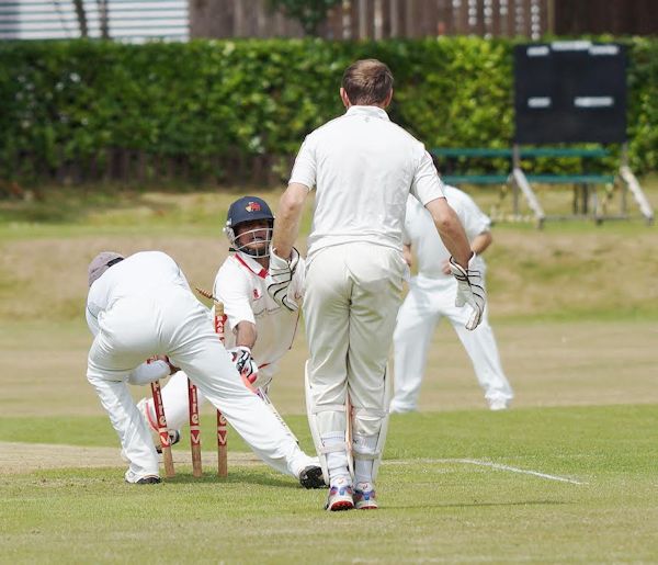 Barrow Professional Kaustubh Pawar being run out by Preston's Jibran Khan (Photo courtesy of Richard Edmondson) |