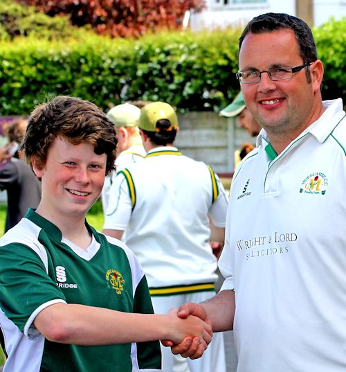 Morecambe 1st XI captain Tommy Clough congratulates Lewis Smith on his 5-8 for the 2nd team at Chorley (Photo courtesy of Tony North) |