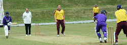 Reg Cupit bowls to Lancaster captain Michael Stevens |