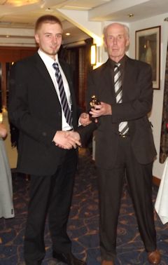 Tom Dickinson accepts the Batting Award on behalf of his son Ian Dickinson (Leyland) from League President Brian Standing |