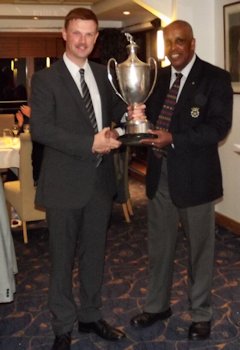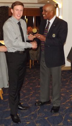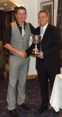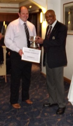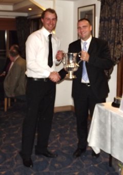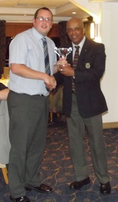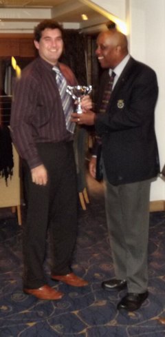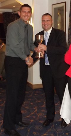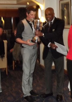Mat Clark receives the Division 1 Championship Trophy fron Guest speaker John Holder