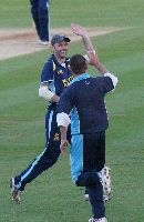 Chris Parry celebrates with Craig Walmsley as he takes the Terry Hunte wicket |