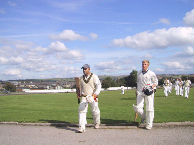 Busy day at the office, Atif Ashraf acknowledges the Darwen crowd as he walks off with Jordan Clarke after scoring 208 no