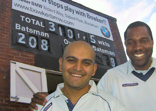 Record breaker Atif Ashraf (centre) with Darwen Captain Keith Semple after scoring a League Record 208 no, off 45 overs as Darwen declared on 310 - 5 at home against Barrow The unbeaten knock included 17 sixes and was the young Pakistani's third successive unbeaten century, 144 no at Netherfield, 140 no at home to Fleetwood It was Keith Semple's last game after 8 years at Darwen