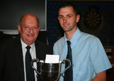 Darwen captain Gary Jackson receives the Division 2 League Cup from League Chairman Norman Poole |