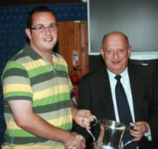 Norman Poole the League chairman watches as Ben Simm receives the Bowling prize fron Matthew Castle |